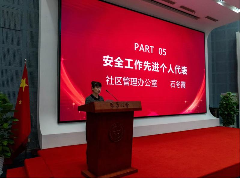 后勤服务中心饮食管理办公室主任赵怀坤、社区管理办公室宿舍管理阿姨石冬霞,分别代表安全工作先进集体和先进个人,分享获奖感言。