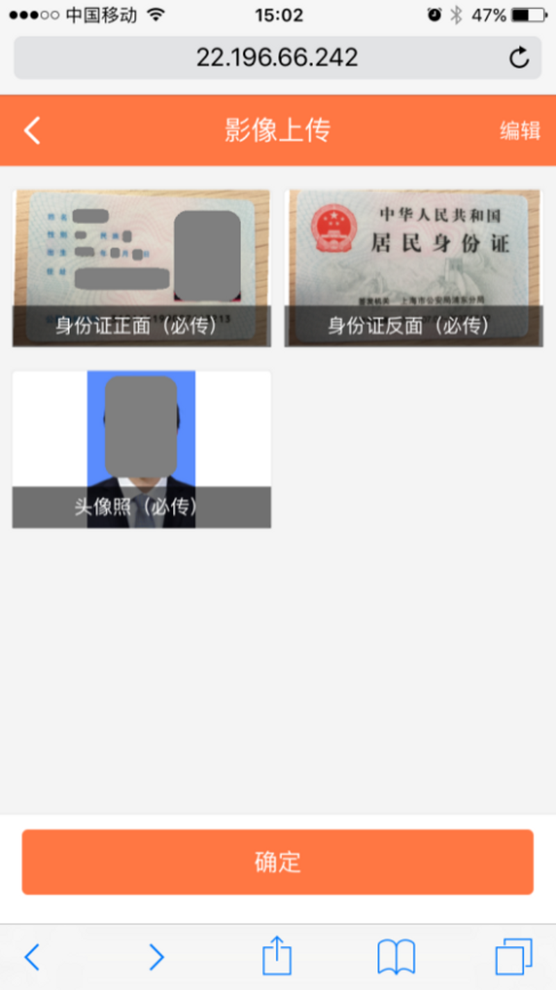 第2步:上传本人的身份证正反面照片和的正面露脸照片(现场拍摄照片)。如下图所示。点击“确定”按键后进入下一步。