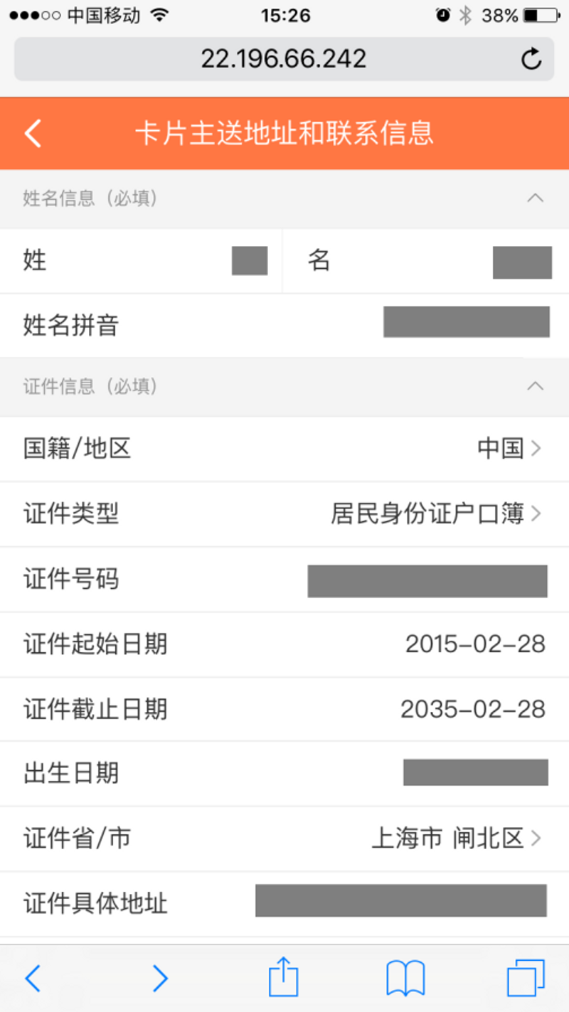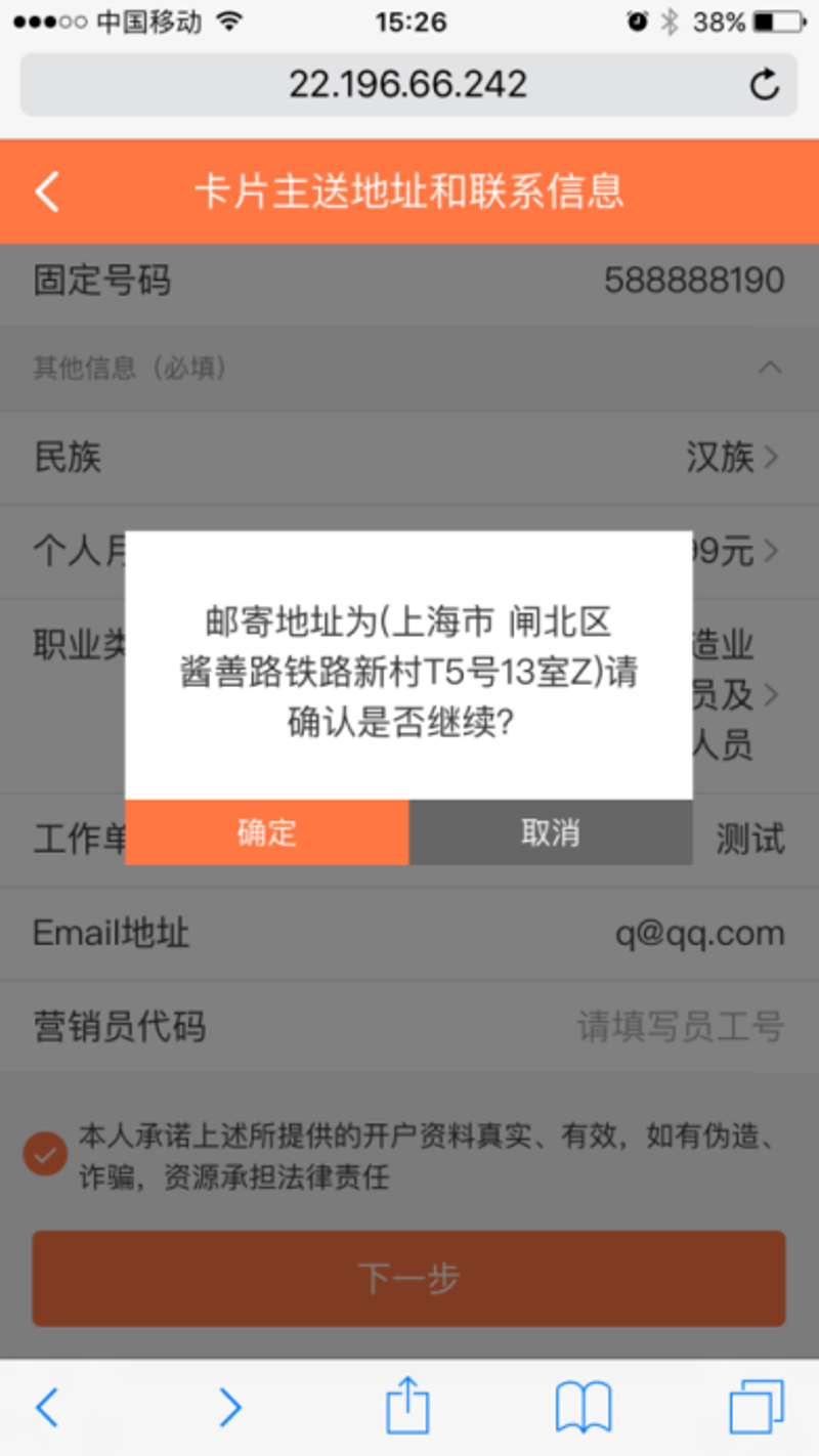 第6步:系统弹出对话框,再次和确认卡片邮寄地址。该邮寄地址是填写的联系信息中的地址。